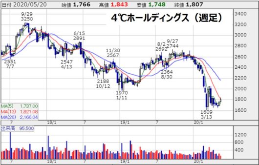 4℃ホールディングスの週足チャート(2020年5月20日)