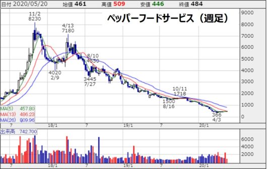 ペッパーフードサービスの週足チャート(2020年5月20日)