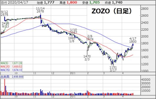 2020年4月17日の終値は1,740円であり、-29.2%も下落しています。