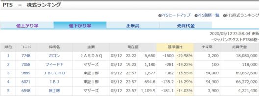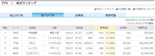ホロンの株価の下落はまだまだ続きます。2020年5月13日時間外での、PTSでのホロンの株価は以下のとおりです。PTSでのホロンの株価は-744.5円(-13.18%)も下落していました。