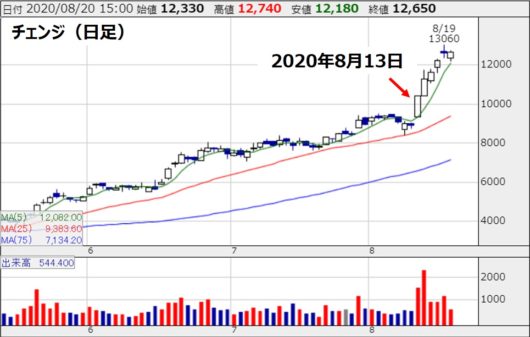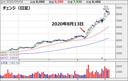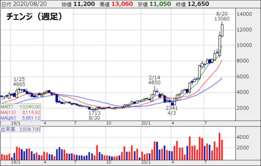 更新情報:どんどん上昇!チェンジの株価(2020年9月6日)